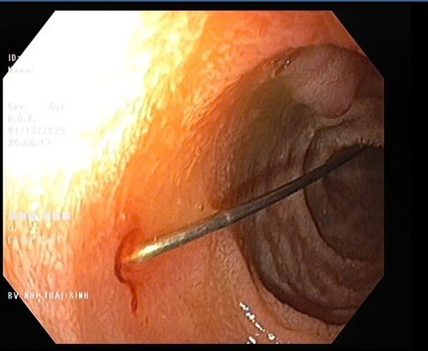 Thủ thuật nội soi được tiến hành lúc 19h12 ngày đội ngũ bác sĩ, điều dưỡng của khoa Tiêu hóa. Hình ảnh nội soi quan sát thấy niêm mạc thực quản và dạ dày của trẻ không viêm loét; tại hành tá tràng D1–D2 phát hiện dị vật kim may dài 4cm, một đầu nhọn cắm vào thành tá tràng, một đầu nhựa tròn hình cúc đang nằm trong lòng ruột. Ê kíp đã sử dụng thòng lọng chuyên dụng tiếp cận đúng vị trí và gắp dị vật ra ngoài an toàn. Thủ thuật diễn ra thuận lợi, không gây trầy xước, không có biến chứng chảy máu sau gắp dị vật