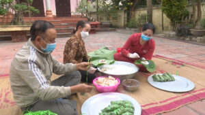 Mùa nào thứ ấy, khi thì lá rong, khi thì lá chuối, rửa sạch từng tàu, để ráo, lau thật khô. Trải tấm lá xanh mát, đầy ắp thiên nhiên xanh sạch, nắm một nắm bột vừa đủ đặt dọc thân lá, cho nhân thịt hành vào giữa, nắn tròn tay, dọc theo sống lá. Nhìn đôi tay thoăn thoắt của người làm bánh chợ Đô Kỳ gập hai đầu lá mới thấy hết nghệ thuật của người gói bánh. Bánh gói xong được giữ bằng những sợi rơm, hoặc dây chuối phơi khô tước nhỏ, quấn quanh thân.
