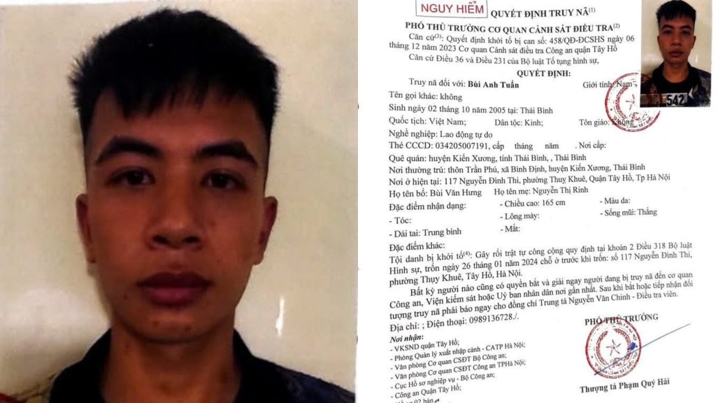 Công an thành phố Hà Nội truy nã đối tượng Bùi Anh Tuấn (SN 2005; thường trú tại xã Bình Định, huyện Kiến Xương, tỉnh Thái Bình (cũ); nay là xã Bình Định, tỉnh Hưng Yên) về tội “Gây rối trật tự công cộng”.